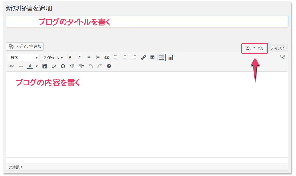 画面を見て分かるように、HTMLの知識など全く必要ありません。Microsoft社のWord(ワード)のようにタイトルとブログの内容を書くだけです。(画面のモードは「ビジュアル」にしています)