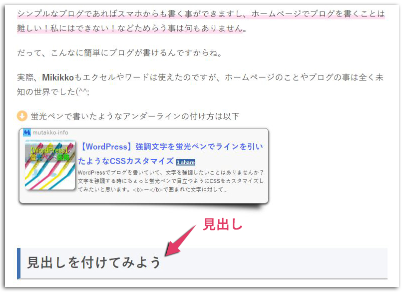下の図のように見出しを付けて文章の区切りを行います。長々な文章では読み手も読みにくいし、内容が変わるところで見出しで区切った方が読みやすいですよね。