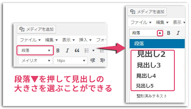 見出しにしたい文字を選択して「段落」の▼を押すと「見出し2」や「見出し3」が出てきます。お好きな見出しに変更してみて下さい。僕は「見出し2」を少しカスタマイズしています。