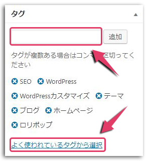 カテゴリーの他にタグを追加します。タグは関連するキーワード的な役割を果たします。
